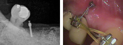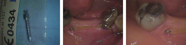 右の写真は歯根の方にマイクロインプラントを埋め、倒れた歯を起こしている症例です。